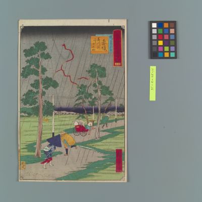 | 7 | 東海名所改正道中記 四十 赤坂 縄手道の夕立 藤川迄二リ十五町 Rekihaku Collection Database (Collections Database of the National Museum of Japanese History) H-22-2-16 |