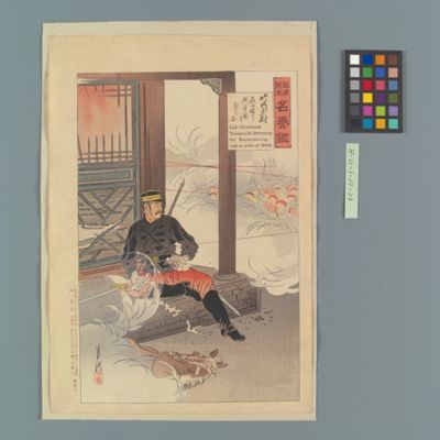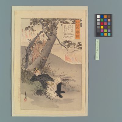 | 14 | 征清美談名誉鑑 立見少将眼前に大敵を控へて睡眠の図 Rekihaku Collection Database (Collections Database of the National Museum of Japanese History) H-22-1-27-2 |