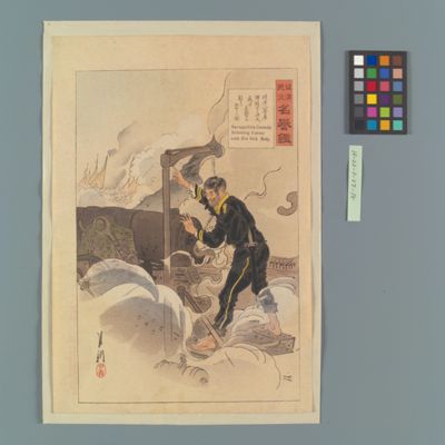 | 16 | 征清美談名誉鑑 赤城艦の一士官死に瀕して □□に 帝国万歳を 唱ふる図 Rekihaku Collection Database (Collections Database of the National Museum of Japanese History) H-22-1-27-13 |