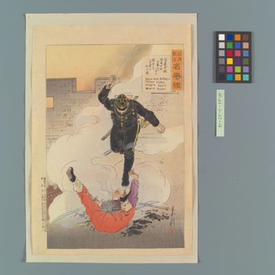 | 19 | 征清美談名誉鑑 斎藤少佐地雷火を仕掛んとする□兵を一刀勇に 切る図 Rekihaku Collection Database (Collections Database of the National Museum of Japanese History) H-22-1-27-16 |
